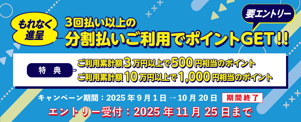 キャンペーン期間 2025年9月1日 ~ 2025年10月20日 ※期間終了 エントリー受付:2025年11月25日まで 対象カード 日専連ファイナンス発行のクレジットカード(各種法人用カード … 続きを読む \もれなく進呈/ 3回払い以上の分割払いご利用でポイントGET!!