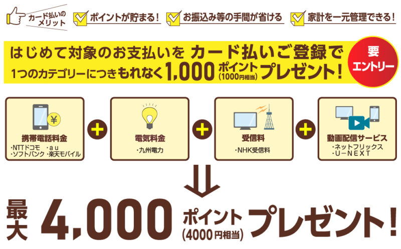 例)本キャンペーンにエントリーのうえ、「NTTドコモ」「九州電力」「NHK受信料」「NETFLIX」を対象カードでのお支払いにされた場合・・・