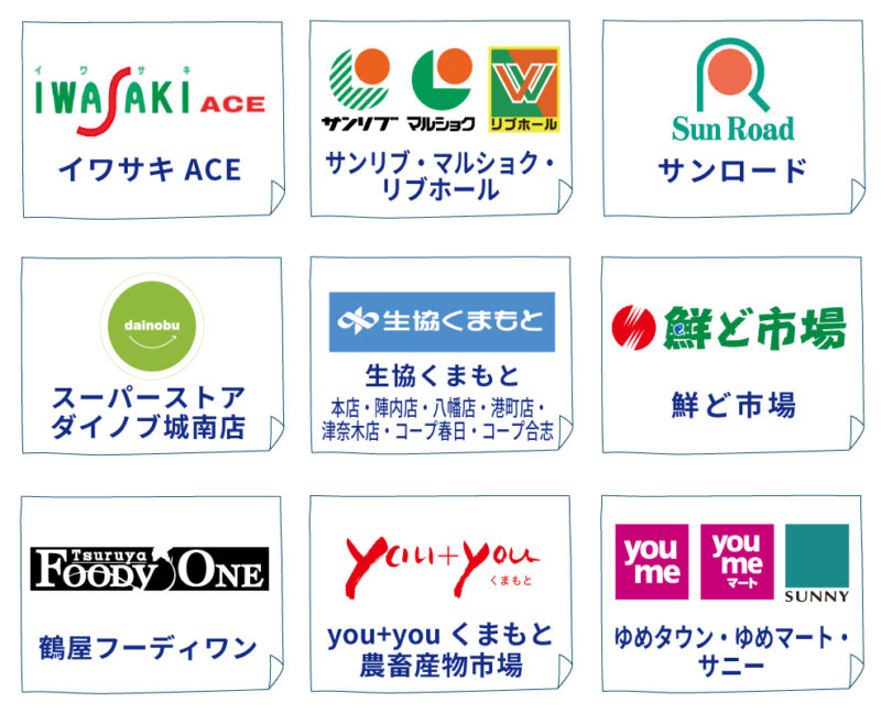 ※ 下記対象店(熊本県内店舗のみ)の 食料品売場 でのカードご利用分が抽選対象となります。
