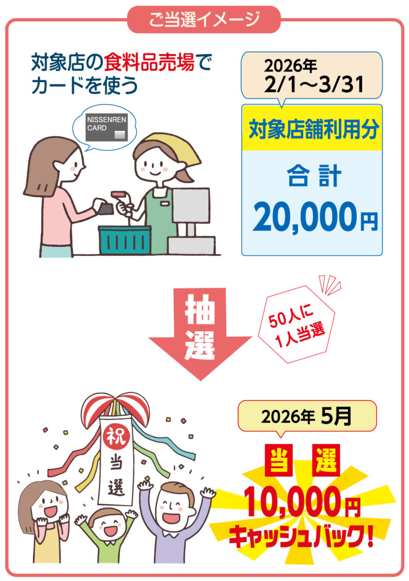 期間中、 対象店の食料品売場 でカードをご利用いただくと、抽選で 50人に1人 に対象店の食料品売場でのカードご利用分の 50%をキャッシュバック いたします。(キャッシュバックの上限額は10,000円となります)