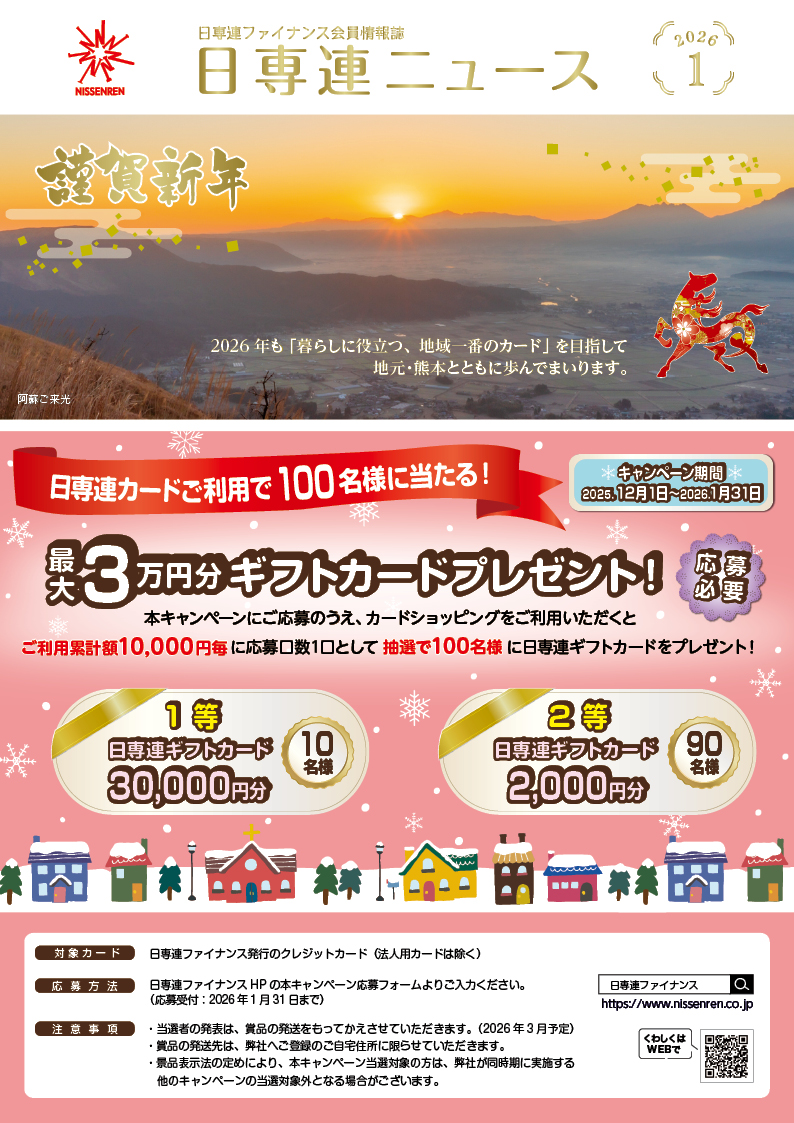 会員情報誌『日専連ニュース』最新号(2026年 1月号) 画像を押下するとPDFが表示されます 最新号 2026年1月号 バックナンバー 2025年12月号 バックナンバー 2025年11月号 バックナンバー 2025年10月号 各種キャンペーンについては ↓ こちらをご覧ください ↓ キャンペーン情報 ポイントアッププレゼントについては ↓ こちらをご覧ください ↓ ポイントアッププレゼント