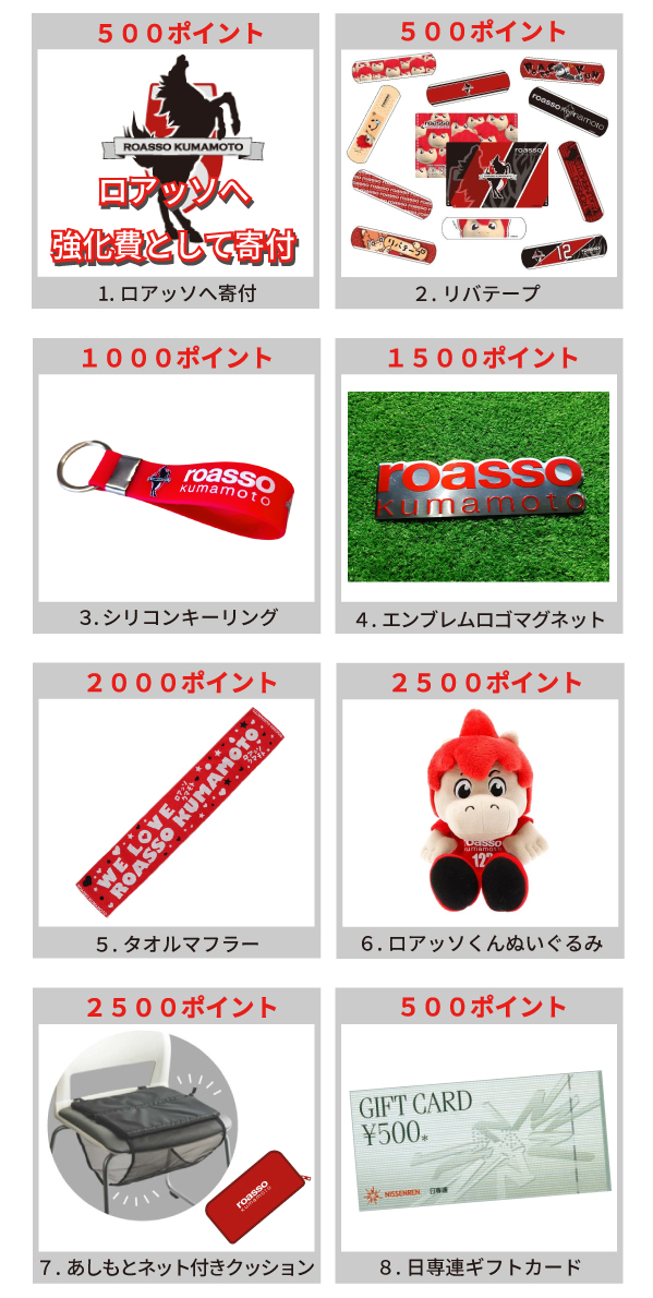 ●「ロアッソへ寄付」および「日専連ギフトカード」へのポイント交換については500ポイント毎の交換となります。